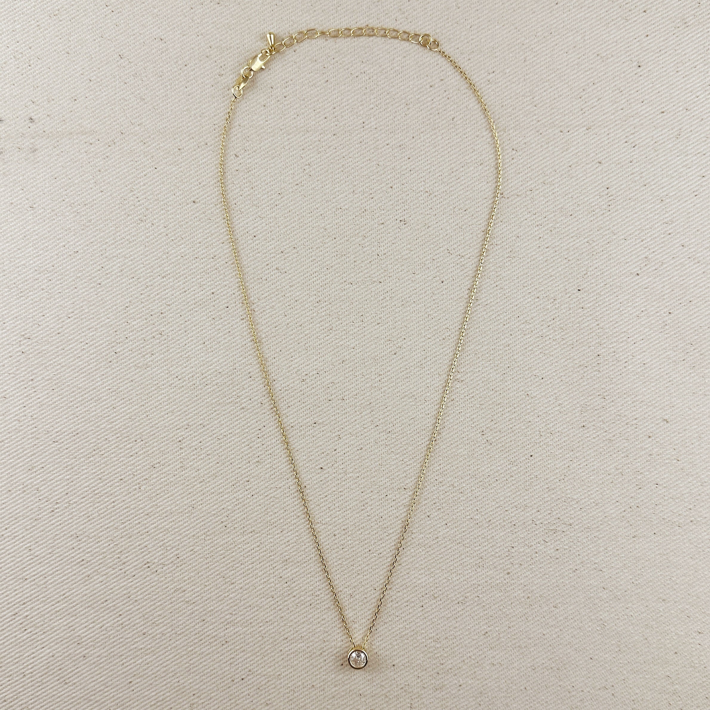 Embrace understated elegance with our 18k Gold Filled Solitaire CZ Necklace. This charming piece features a brilliant 6.5mm round cut cubic zirconia stone, securely set in a bezel setting that enhances its sparkle. The solitaire pendant hangs gracefully from a delicate 16-inch link chain, complemented by a 2-inch extender for adjustable length.