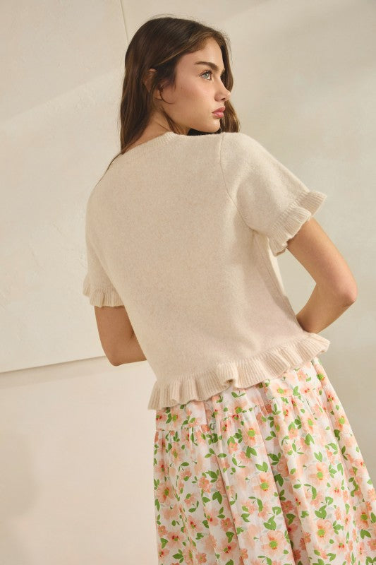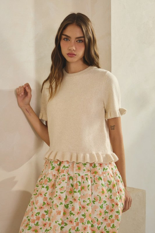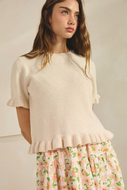 Soft and simple with a feminine touch, this knit tee is an easy essential for spring layering. Fabric & Fit Lightweight cotton-blend knit with a gentle, soft hand feel. Designed in a relaxed fit that falls at the waist, perfect for both casual and dressed-up styling. Design Short sleeves with subtle ruffle edges Ribbed crew neckline for a clean finish Delicate ruffle hem for a feminine detail Easy pullover silhouette Recommended Use Perfect for everyday wear, layering under blazers, or pairing with denim for a casual look. Extra Info SELF: 66%POLYESTER 22%ACRYLIC 10%WOOL 2%SPANDEX