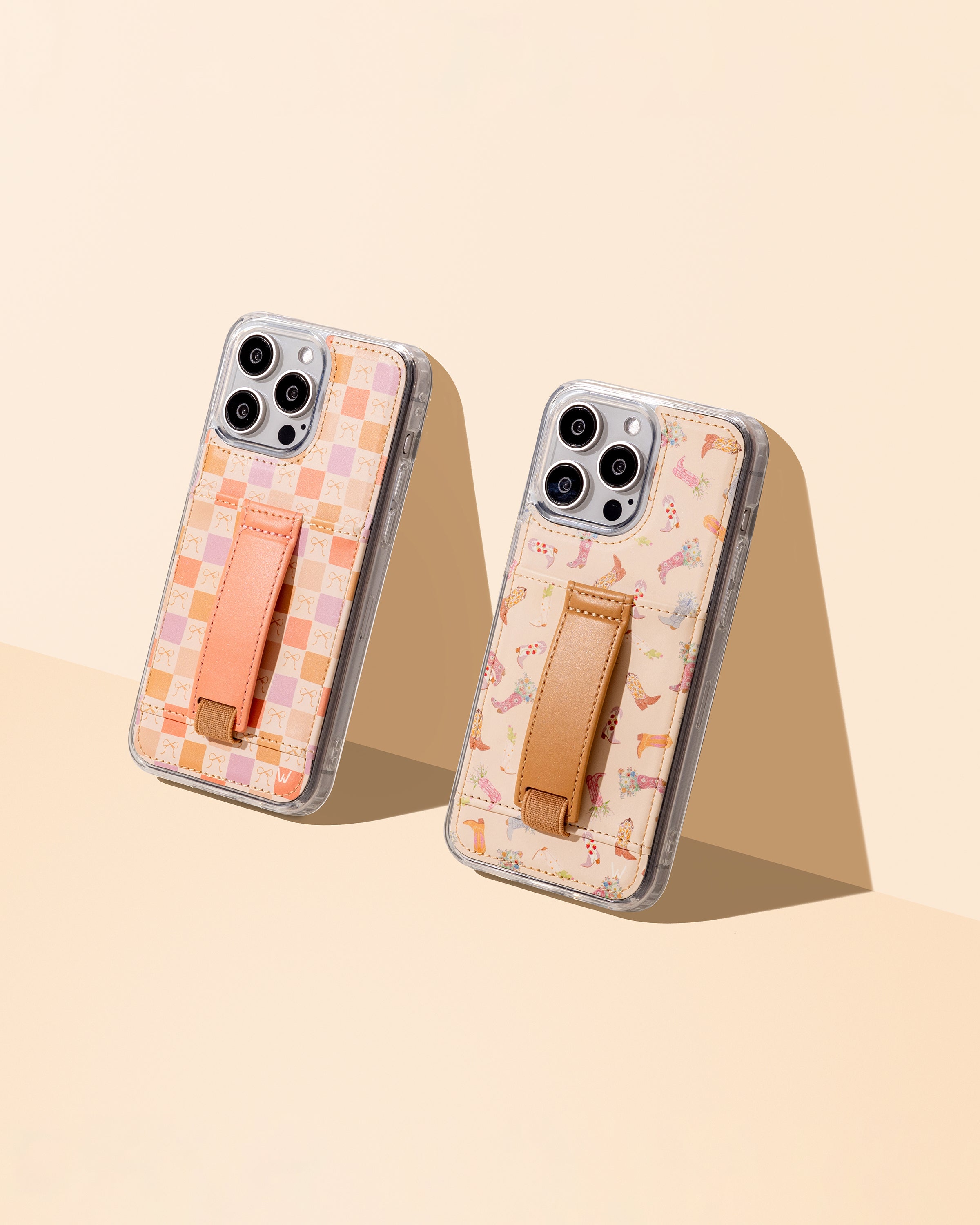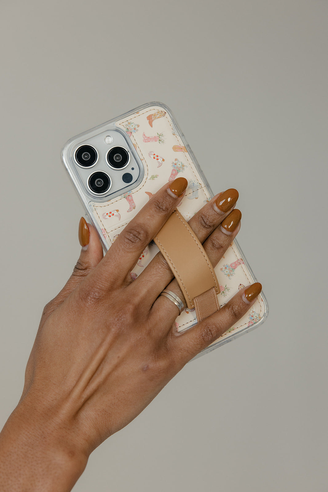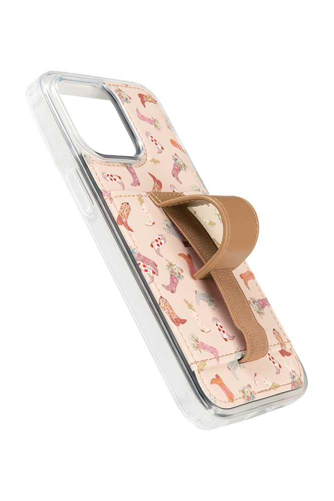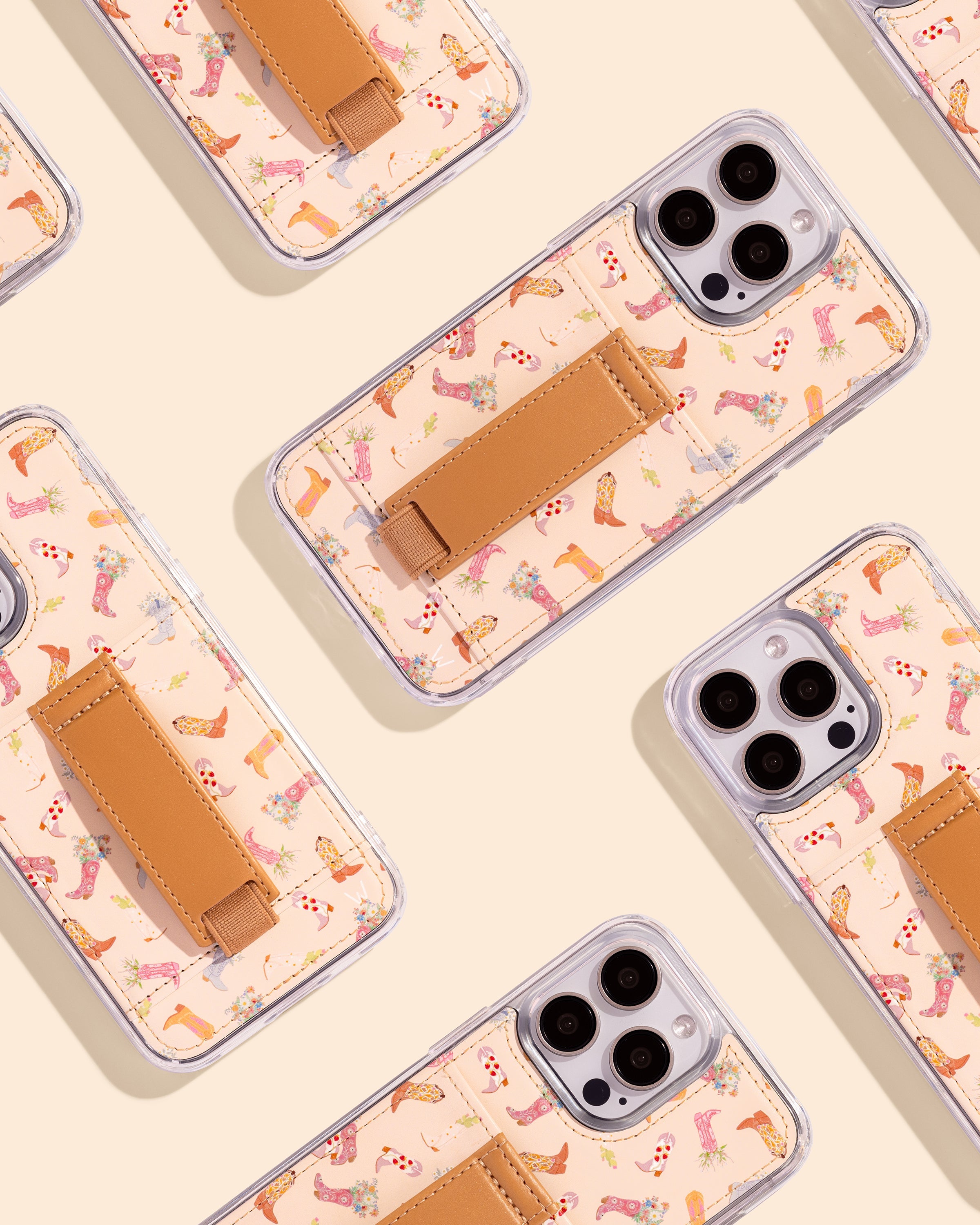 Case Design: Pink, slate and brown cowboy boots filled with flowers on a beige background