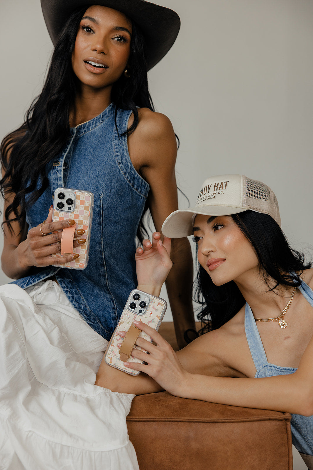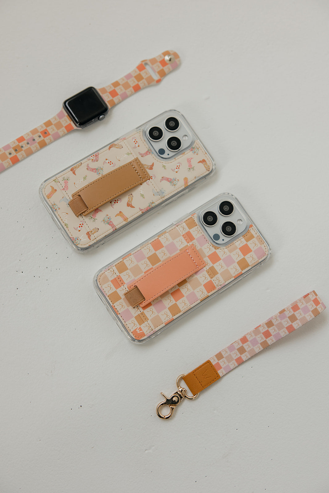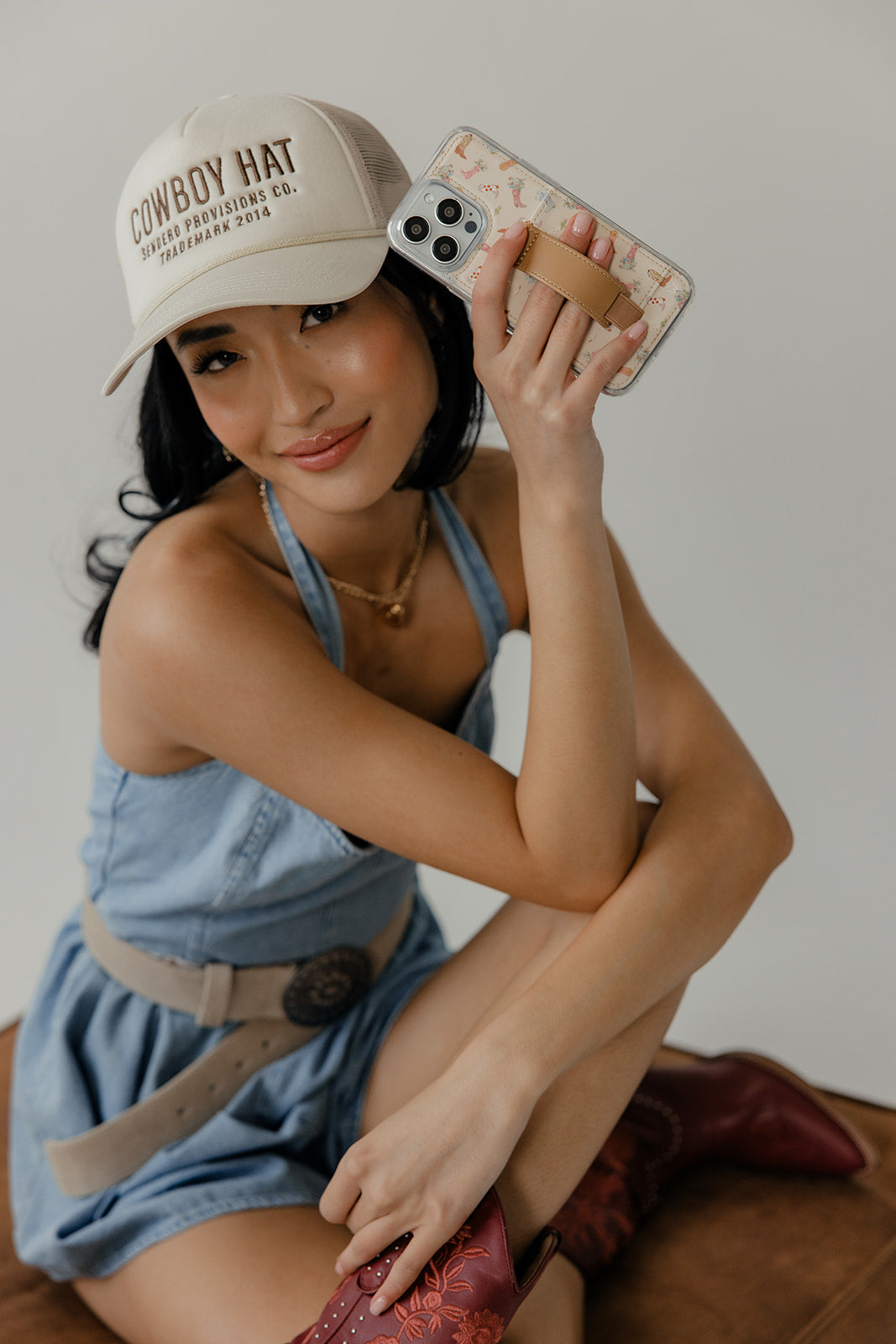 Case Design: Pink, slate and brown cowboy boots filled with flowers on a beige background