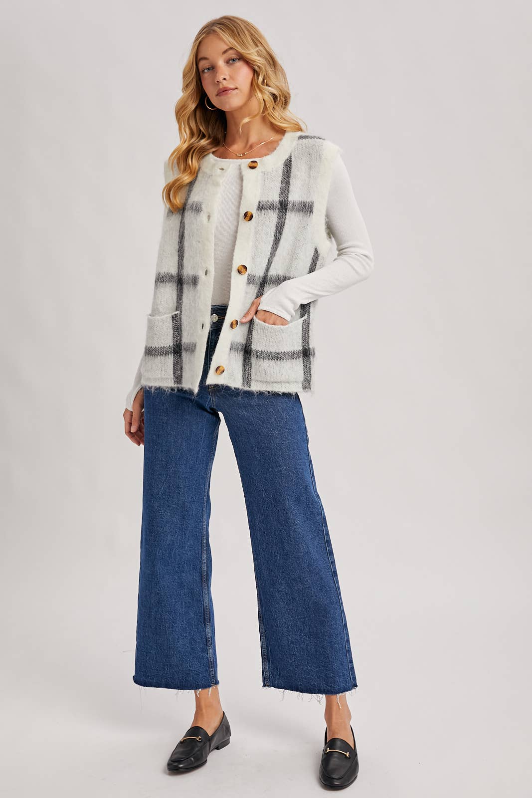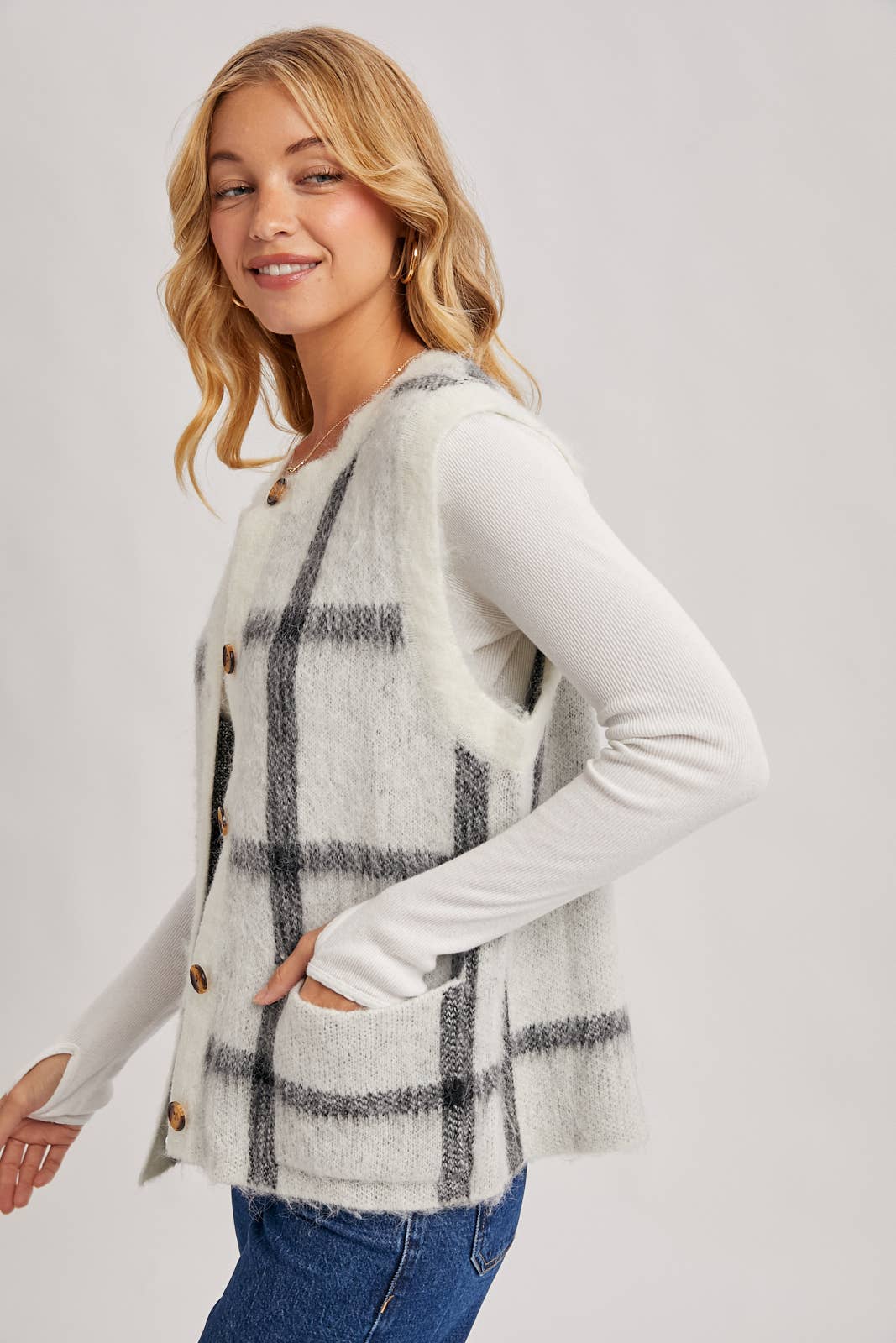 Button Down Plaid Knit Sweater Vest: Mocha