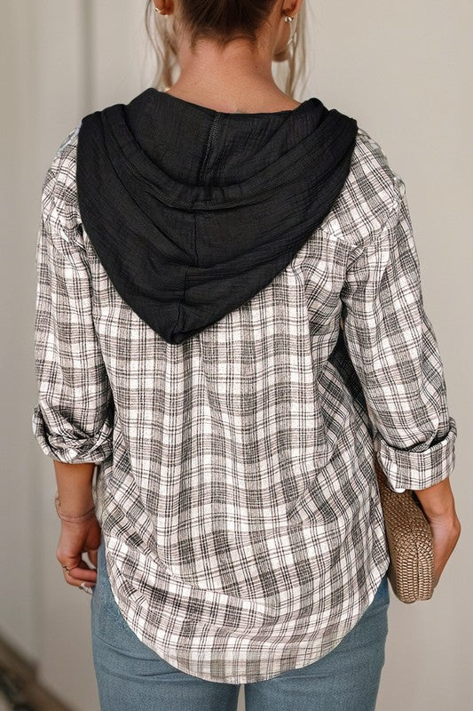 Checkered Print Hooded Patchwork Loose Fit Shacket