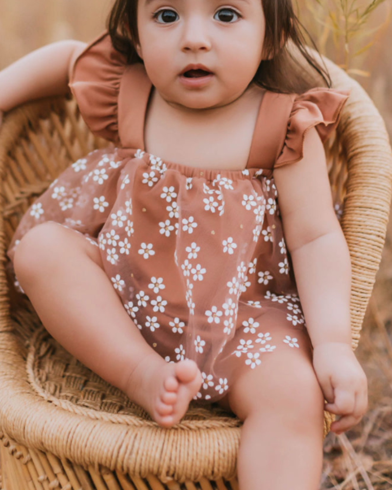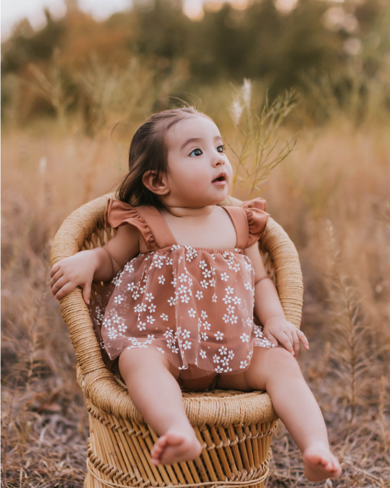 Your baby girl will look oh-so-sweet in our Dixie tutu dress! This infant and toddler floral romper features a dress bodice with a ballerina-inspired tulle skirt. With a full coverage bloomer bottom for ultimate modest comfort, she can run and crawl about with ease.