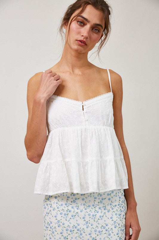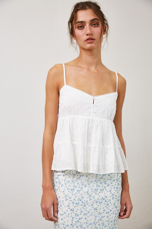 A breezy and romantic cami top perfect for warm days. -Made from lightweight cotton eyelet fabric -Smocked back panel for a comfortable, adjustable fit -Flowy peplum silhouette that flatters the waist -Delicate eyelet embroidery throughout -Adjustable spaghetti straps -Sweetheart neckline with subtle front button detail -Tiered peplum hem for added movement and charm -Imported Recommended Use Ideal for summer picnics, beach days, or layering under light cardigans.