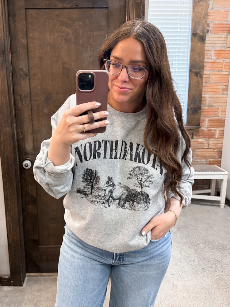 Show your North Dakota pride in the coziest way. Our North Dakota Bison Top features an original graphic designed by Boutique 23 owner, Danita, and is hand-pressed in-house at Boutique 23 for a one-of-a-kind feel.