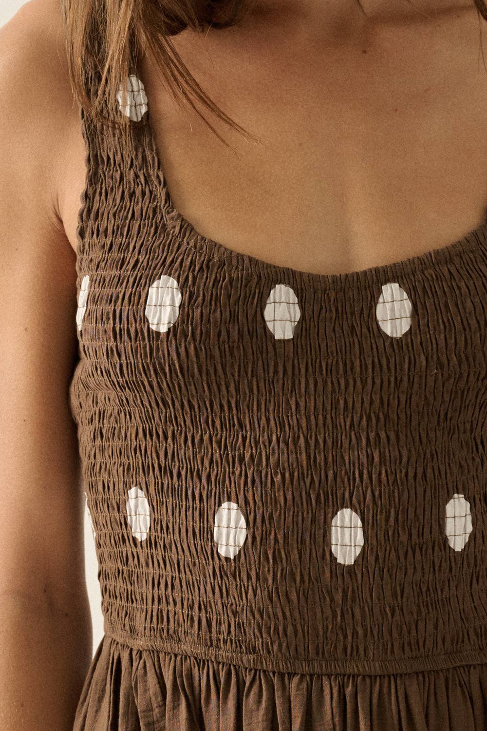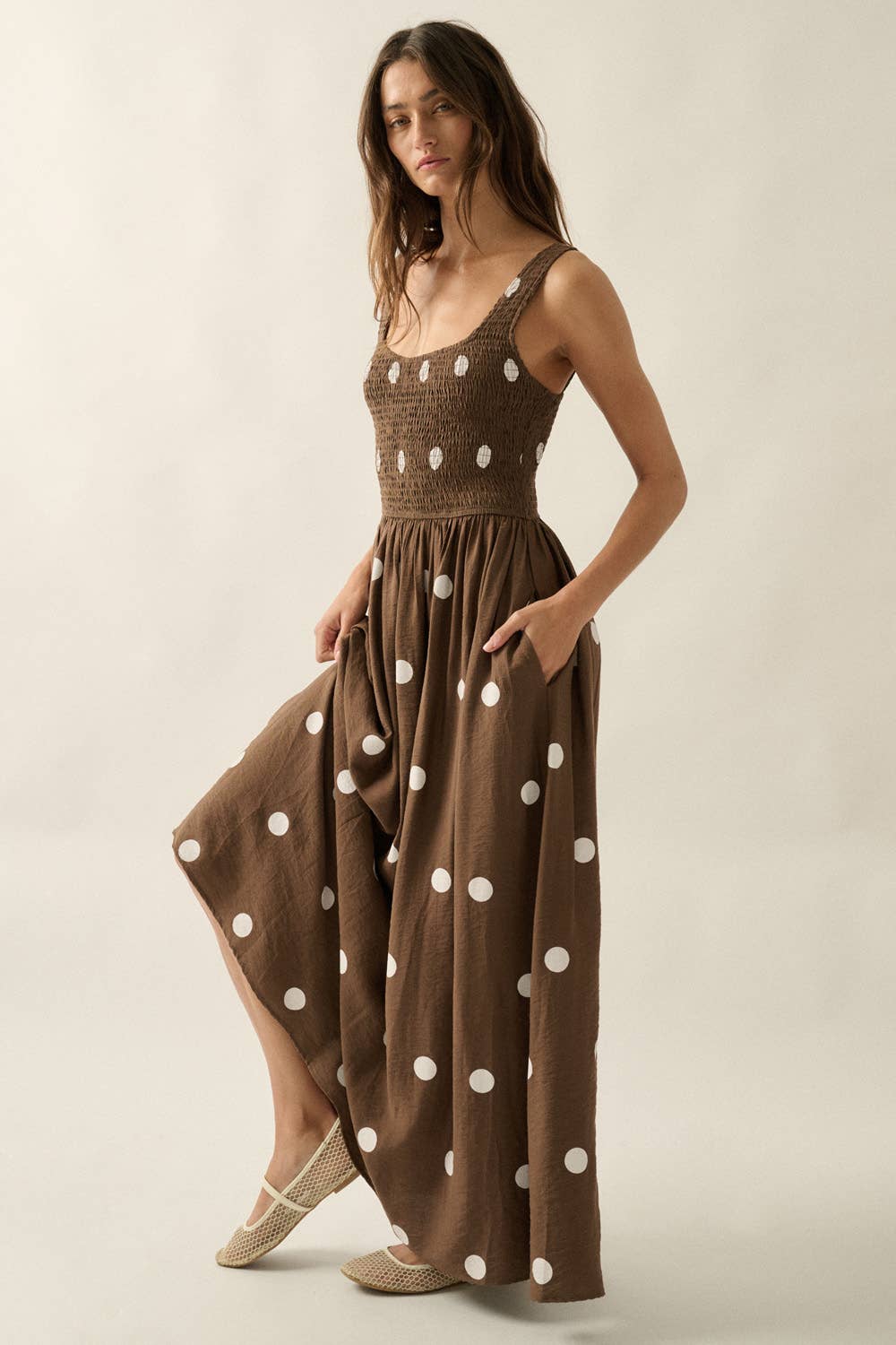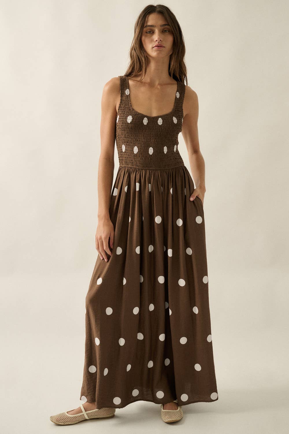 Polka Dot-print Smocked Sleeveless Pocket Maxi Dress: Chocolate