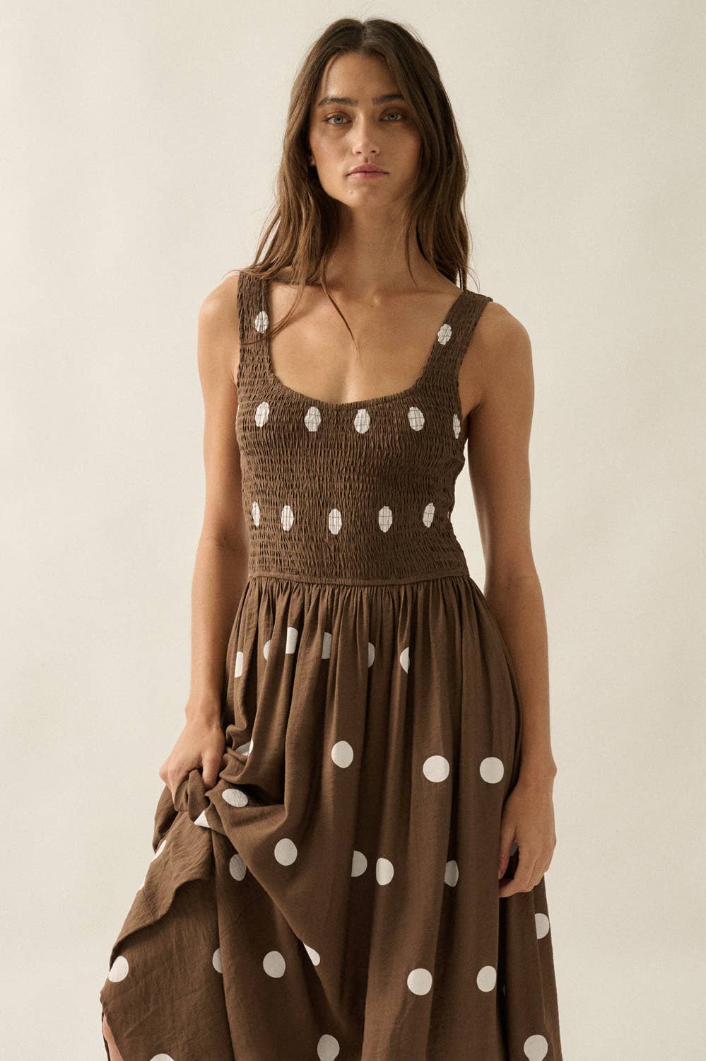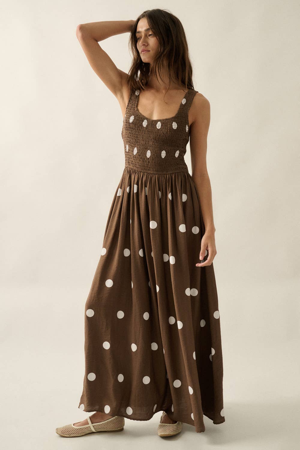 A polka dot-print maxi dress with the following features: Square sweetheart neckline. Smocked bodice. Sleeveless with wide shoulder straps. Gathered skirt. Side seam pockets. Low back. Partial thigh-length lining. Ankle length. Fit-and-flare silhouette. Model Info: Height: 5 ft 7 in | Bust: 31 in | Waist: 24 in | Hips: 35 in | Wearing Size S.