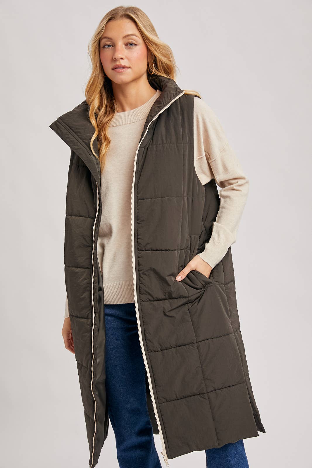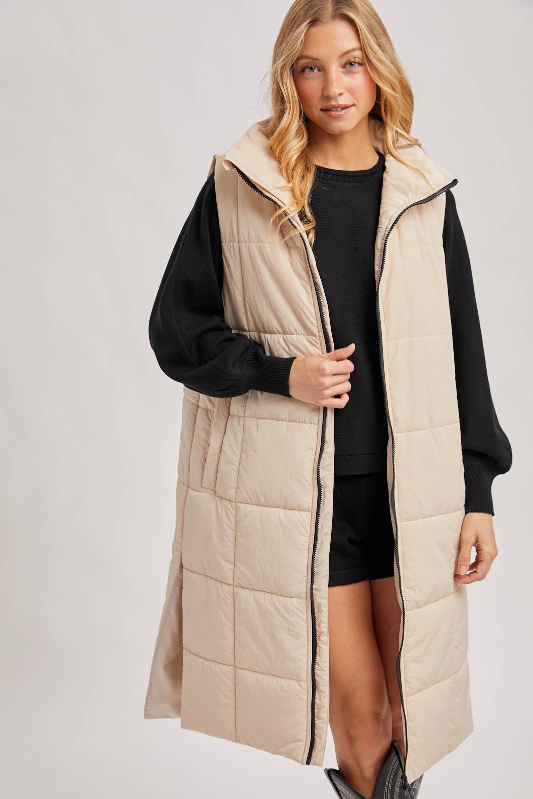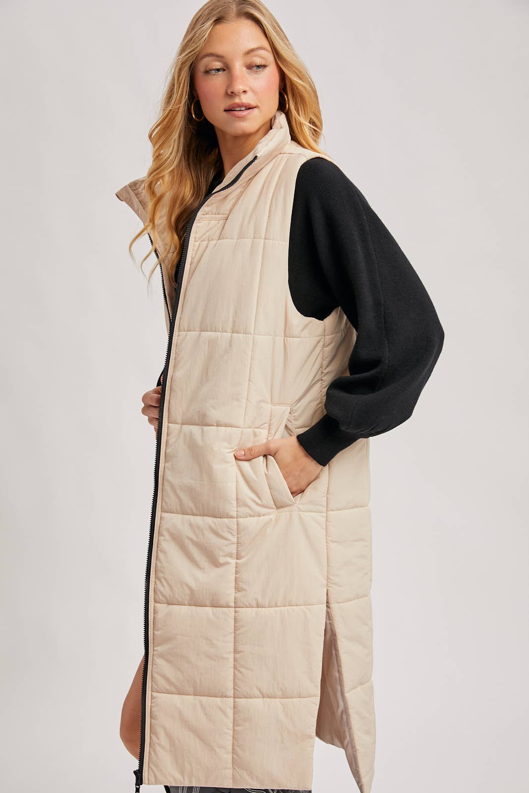 Quilted Longline Puffer Vest: Sand