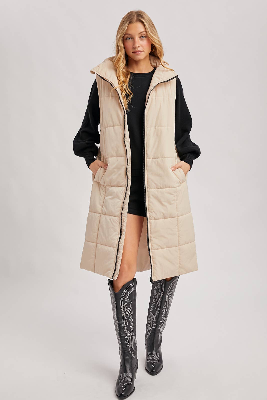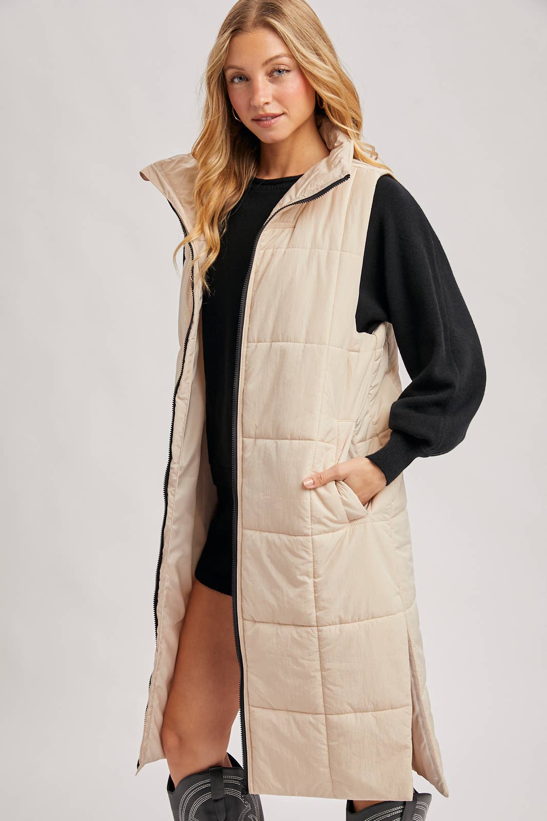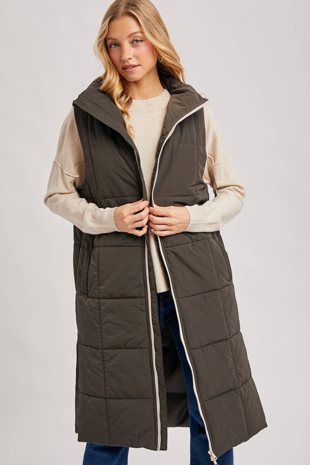 Quilted Longline Puffer Vest: Sand