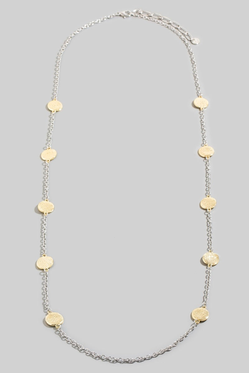 - This chain necklace features a fashionable textured station coins long style. Explore a refined sense of style with this chain necklace, seamlessly elevating the chic factor of your look.